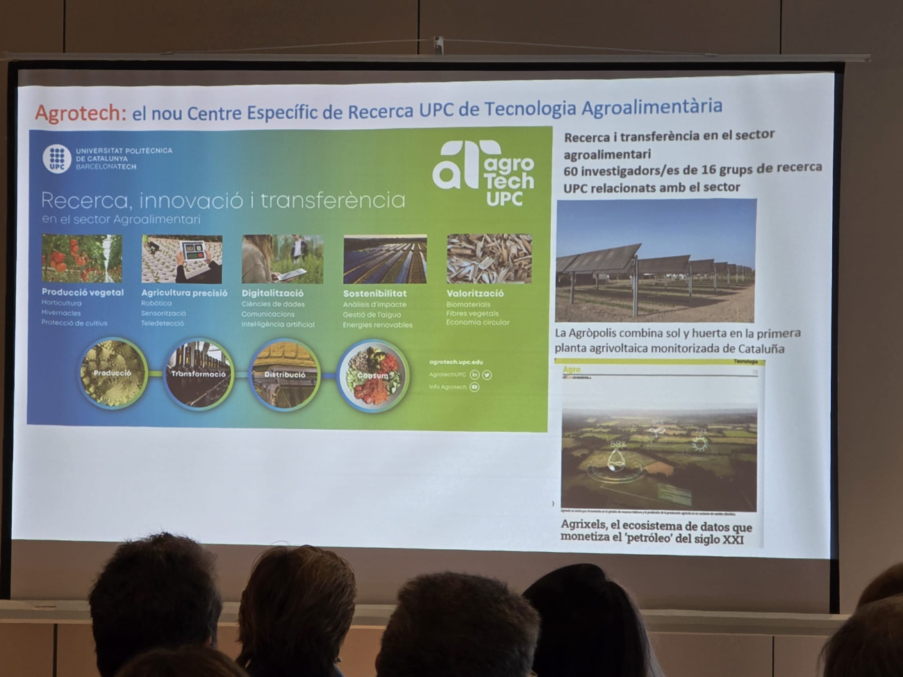 Un dels projecte que s’ha destacat és el d’Agrotch, un centre específic de Tecnologia Agroalimentària on treballen 60 investigadors en 16 grups de treball relacionats amb el sector. En aquest context s’ha començat a combinar el sol i l'horta, amb la primera planta agricoltaica monotoritzada de Catalunya, on es genera energia solar i amb l'ombra que provoquen les plaques fotovoltaiques es realitzen diferents pràctiques. En aquests moments hi ha 150 empreses del sector agroalimentària incorporades a Agrotech. El nou grau en enginyeria i gestió d'empreses agroalimentàries amb components tecnològiques i de formació en economia per gestionar millor les explotacions també és una altra de les aportacions del campus de Castelldefels de la UPC al costat del Parc Agrari del Baix Llobregat.
