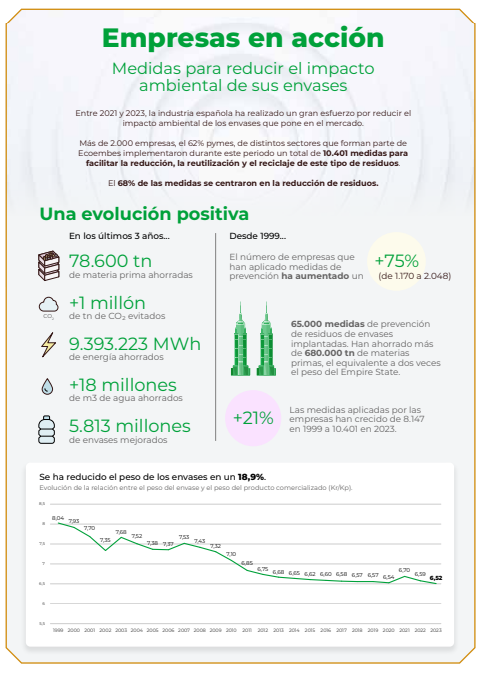 El compromís d’aquestes empreses queda reflectit a l’últim Pla Empresarial de Prevenció i Ecodisseny (2021-2023) d’Ecoembes, període en què s’han aplicat 2.676 mesures d’ecodisseny, 543 mesures més que les implementades al pla de 2018- 2020. Dentre totes elles, les destinades a la primera R, la de reducció, han estat majoritàries: 1.873 mesures, un 70% del total. Aquestes mesures d’ecodisseny han estat enfocades al redisseny dels envasos, per exemple, usant envasos amb més capacitat d’emmagatzematge; a la disminució del seu impacte ambiental, eliminant tintes o vernissos o usant materials procedents de fonts renovables; i el menor ús o eliminació de material necessari en la fabricació.