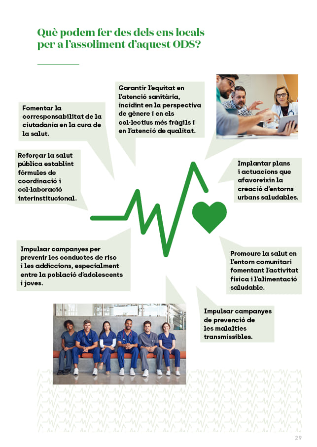 Sota aquesta evidència, és important generar sinergies entre els diferents àmbits de l’acció política local per fomentar entorns urbans saludables i contribuir així a la millora de la salut de la població. Tenir present l’impacte sobre la salut del disseny de qualsevol element de les nostres ciutats i pobles (pla urbanístic, jardí, plaça, xarxa de transport, barri, equipament, etc.) és el més clar exemple de l’estratègia adreçada a les administracions locals. Salut a totes les polítiques, ja que es requereix el treball conjunt entre diferents professionals. En aquest sentit, molts ajuntaments de la comarca del Baix Llobregat contribueixen a aquest ODS creant entorns urbans saludables, restringint el trànsit per millorar la qualitat de l’aire o promovent pràctiques saludables com l’activitat física i l’alimentació equilibrada.