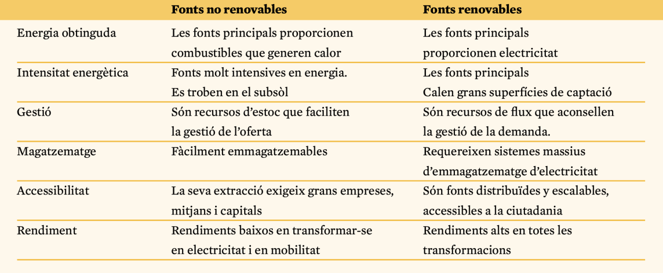 Entre els canvis en la matriu energètica, l’expert assenyala que cal destacar que passem: a) De l’energia del foc a l’electricitat; b) De l’extracció de recursos concentrada en certes localitzacions (mines, pous, refineries, centrals) al desplegament d’extensíssimes instal·lacions de captació d’energia en superfícies i territoris; c) De disposar d’una energia de gran intensitat (els fòssils) a potències molt més moderades de les energies renovable; o d) D’un sistema energètic basat en estocs (els fòssils) que facilita la gestió de l’oferta a un altre sistema basat en fluxos (radiació solar, vents) on caldrà posar el focus en la gestió de la demanda i l’emmagatzematge d’electricitat.